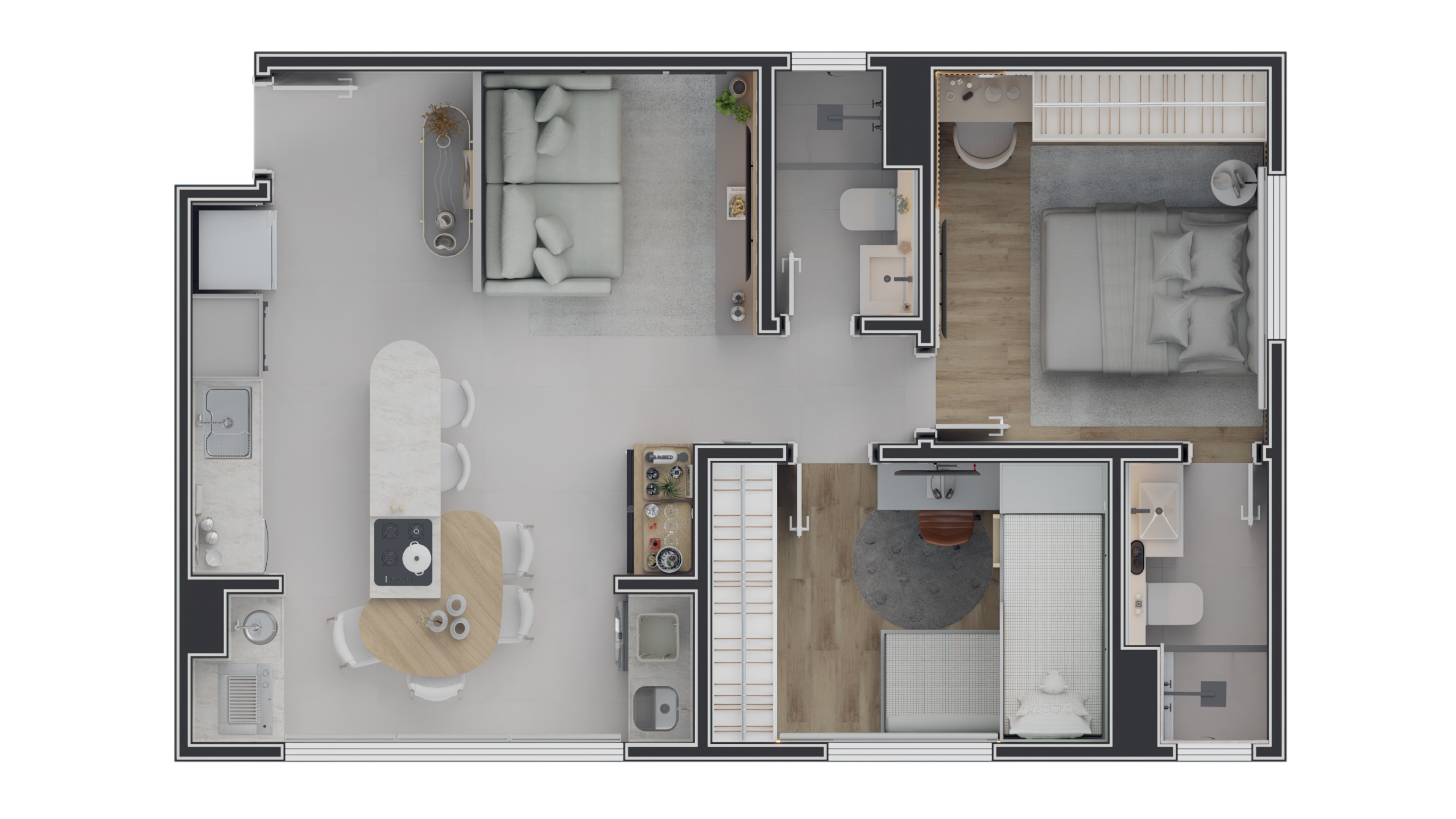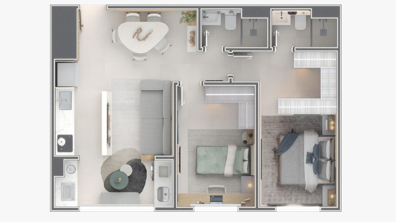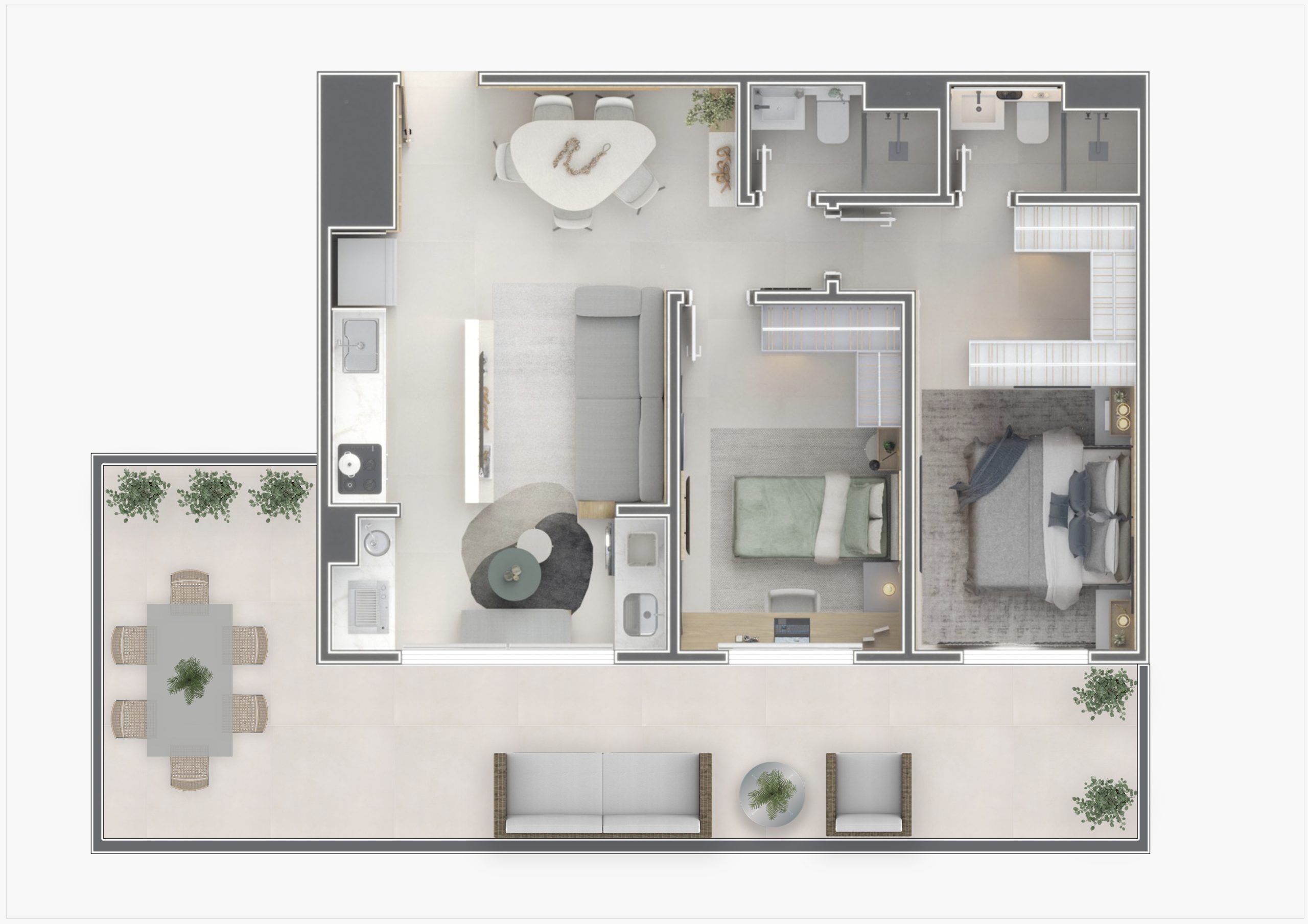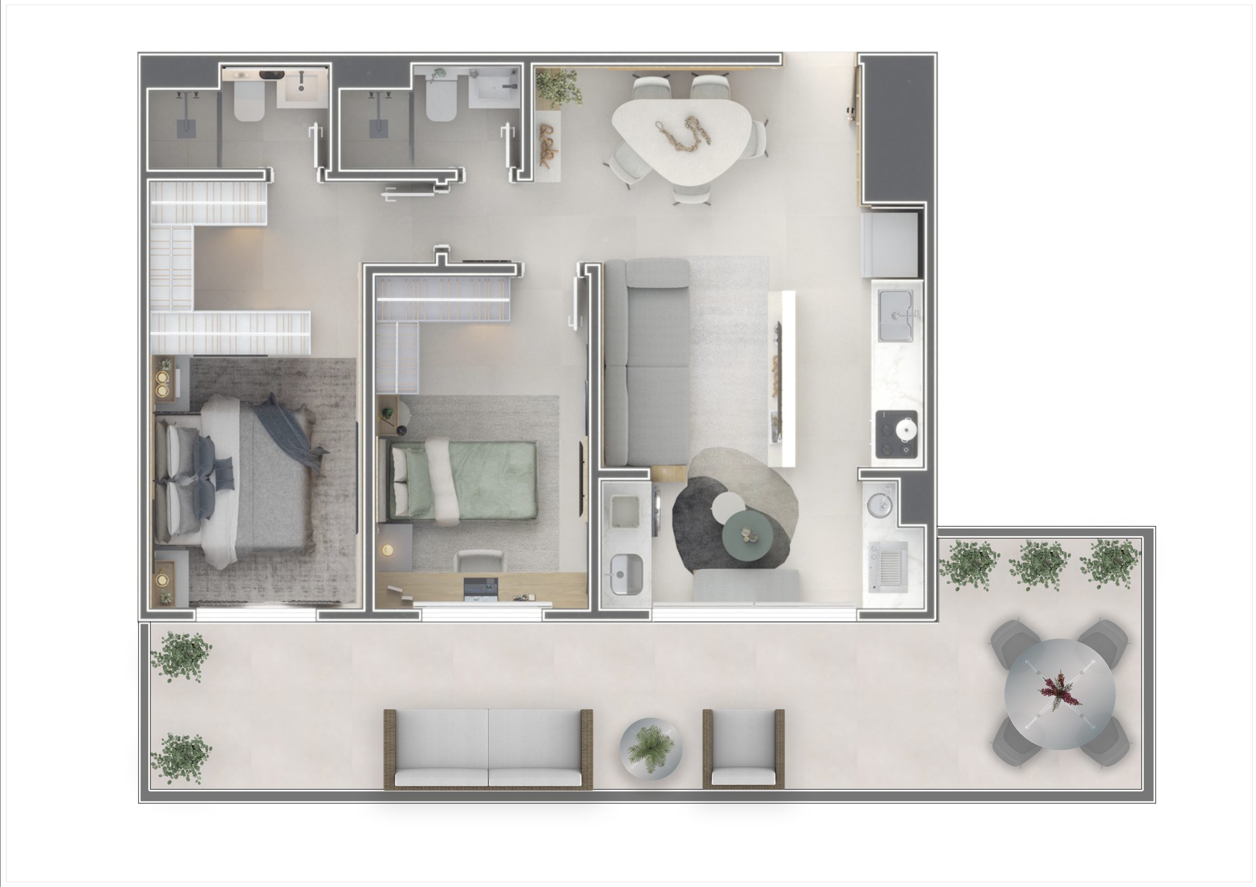 Sala de Estar e Jantar e Cozinha conjugados / Suíte / Dormitório / WC / Varanda Grill com infra para churrasqueira elétrica / Área externa descoberta